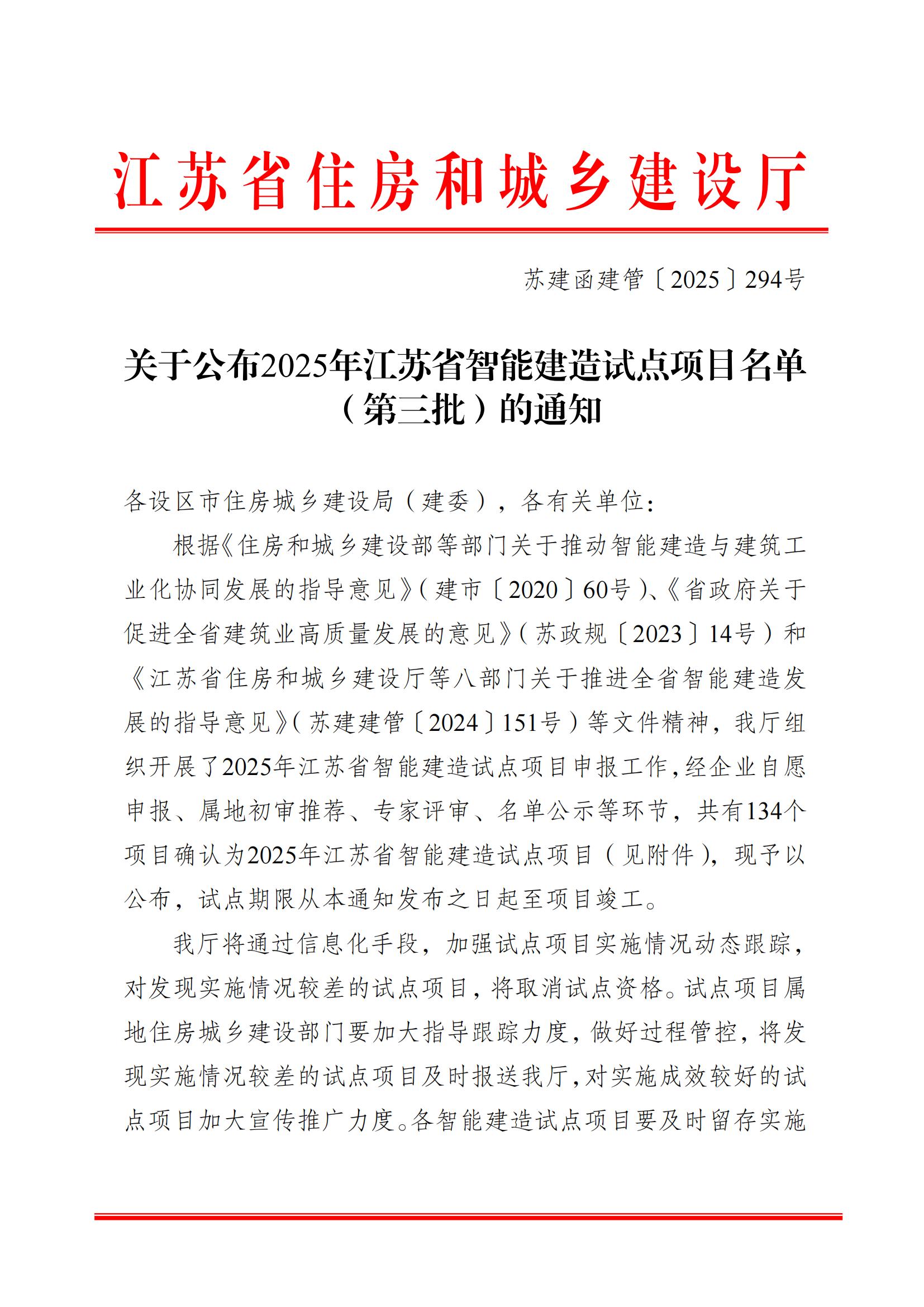 近日,江蘇省住房和城鄉建設廳正式公布了2025年度江蘇省智能建造試點項目名單(···